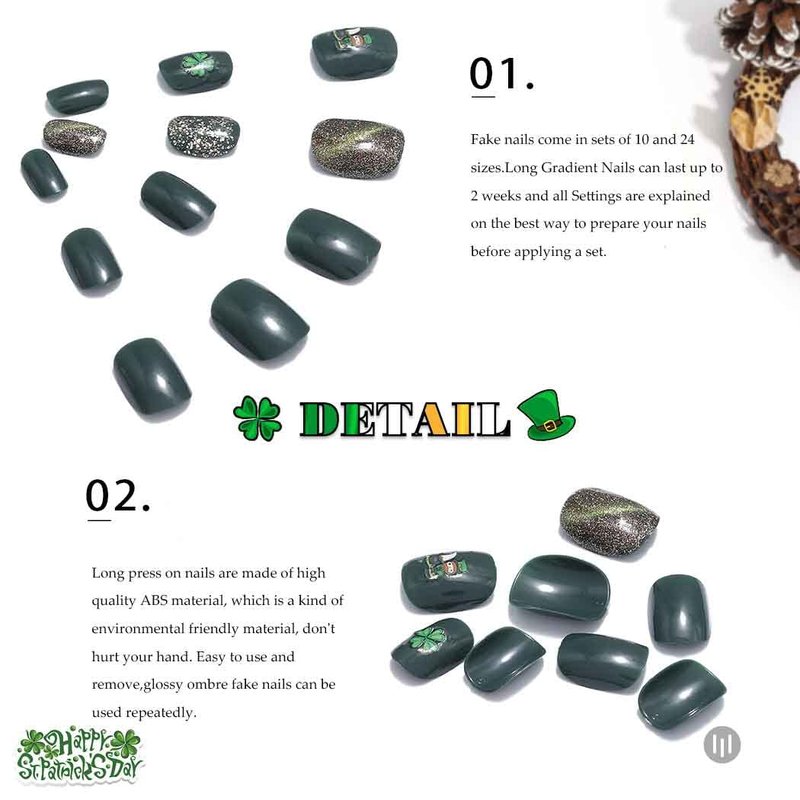 Material:Glossy press on nails are made of ABS material,which is a kind of green friendly environmental material,No toxic,No smell,No harm to your nails or body and makes the nails durable & natural.