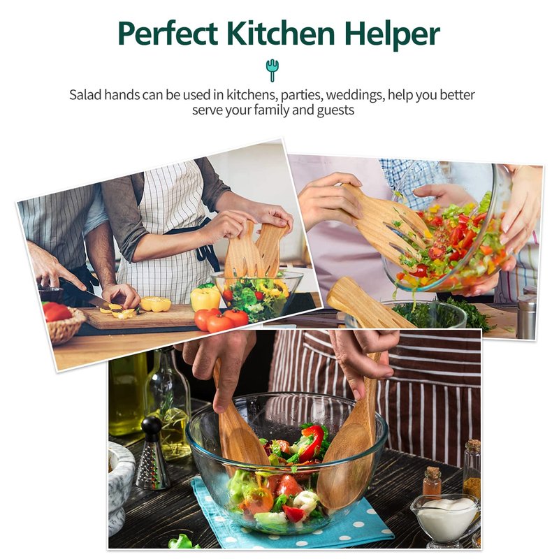 Warm Tips: Please wash them manually with neutral soap and warm water, dry it thoroughly after each use Please store them in a well-ventilated place and keep them away from heat and sunlight. Please DO NOT put into dishwasher, microwave, freezer or oven. Specifications: Item Name: Salad servers salad hands set Salad Spoon Size: 10.2 × 2.8 inches Salad Fork Size: 10.2 × 2.8 inches Salad Hand Size: 7.1×3.7 inches Package Weight: 0.6 lb Package List: 1 × Salad spoon 1 × Salad fork 2 × Salad hand