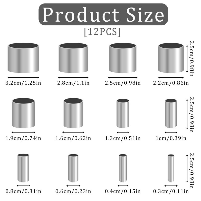 Single product size: outer diameter from small to large: 0.3cm, 0.4cm, 0.6cm, 0.8cm, 1cm, 1.3cm, 1.6cm, 1.9cm, 2.2cm, 2.5cm, 2.8cm, 3.2cm, height 2.5cm