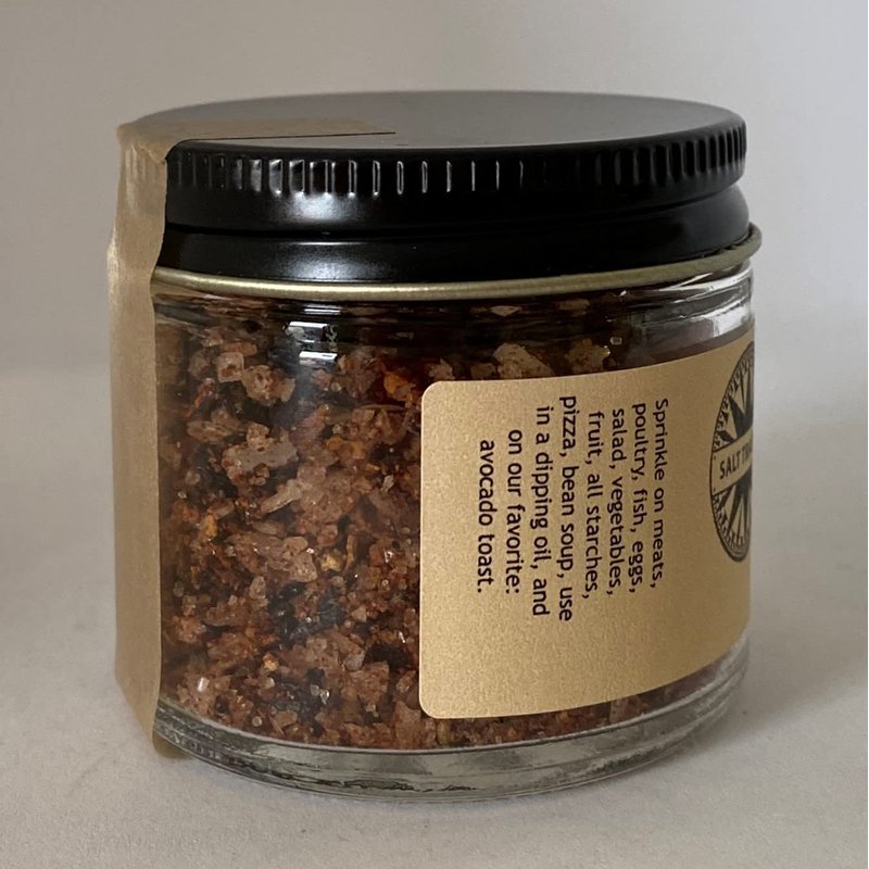 This warm and richly flavored salt blend is made with four different types of chile peppers and moist sea salt. Not too spicy, but not quiet either. A blend of chile flakes and chile powder, use this salt on everything.