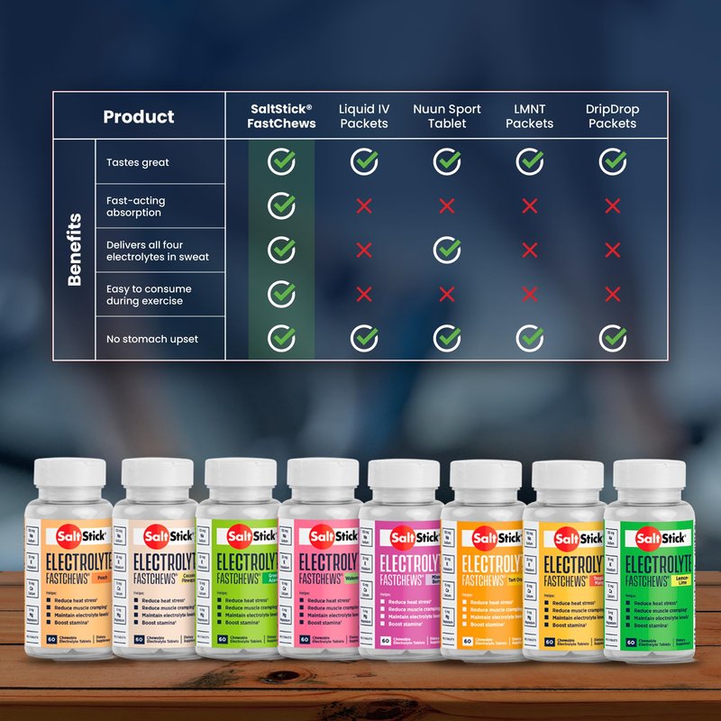 - CHEWABLE ELECTROLYTE TABLETS: SaltStick FastChews are chewable bite-sized electrolyte tablets packed with sodium, potassium, calcium, and magnesium. These electrolyte chews were designed to replace the essential electrolytes lost through sweat to keep the body hydrated during endurance workouts, reduce heat stress, and to provide leg cramps relief.