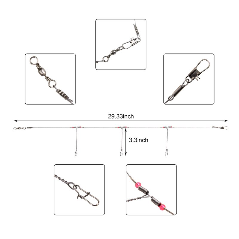 Package Content: Stainless Steel Fishing Wires Rigs 12pcs, length 27.5inch(2 Arms)/30inch(3 Arms), fishing hook 30pcs, pyramid sinker 4pcs