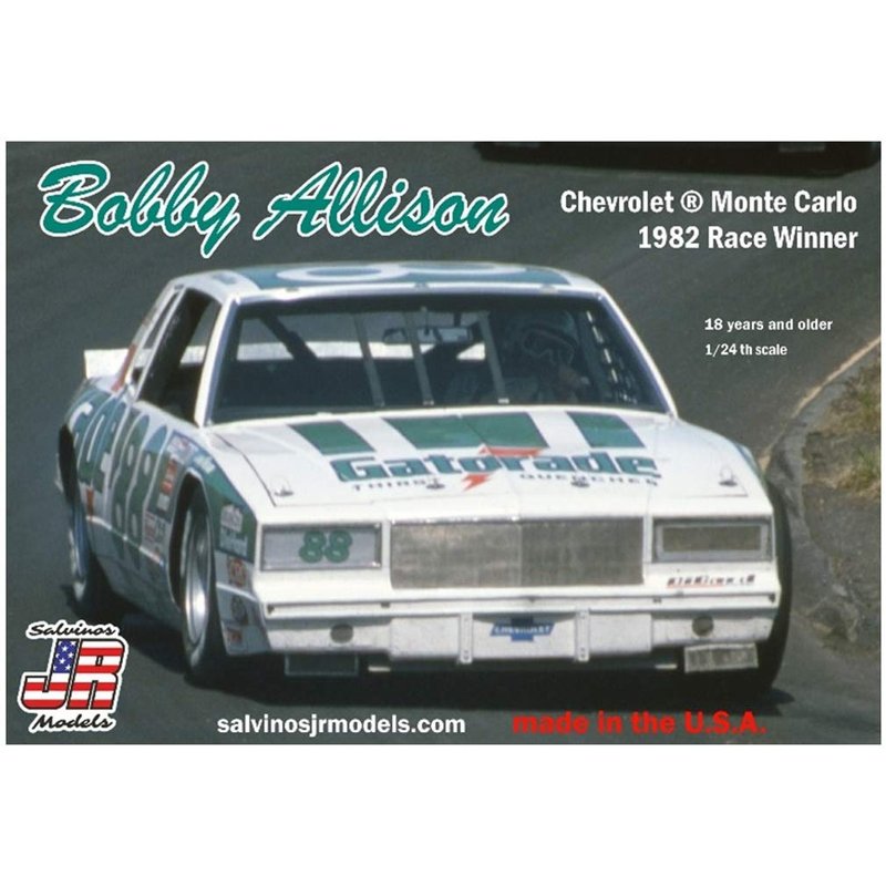 This is the sensational Bobby Allison Monte Carlo from 1982, the NASCAR Race Winner Model Kit. Kit comes to you brand new in a 1:24 scale, and it's a beautifully detailed kit, the kind you expect from Salvinos JR Models. Model is recommended for advanced hobbyists 18 years and over. Kit requires assembly, all parts and instructions for assembly included. Hobby cement and paint not included. An amazingly detailed kit with high resolution waterslide decals to complete your project.