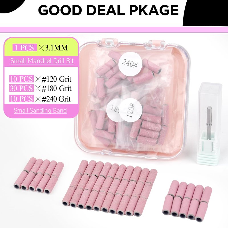 - SALVMARY UPGRADE 3MM SMALL SANDING BAND NAIL DRILL BIT SET - Come with 1PCS 3.1MM Small Mandrel Bit ( Mandrel Shank Size: 3/32" ) ; 10 PCS #120 Medium Grit Small Sanding Bands ; 30 PCS #180 Fine Grit Small Sanding Bands ; 10 PCS #240 Extreme Fine Grit Small Sanding Bands.