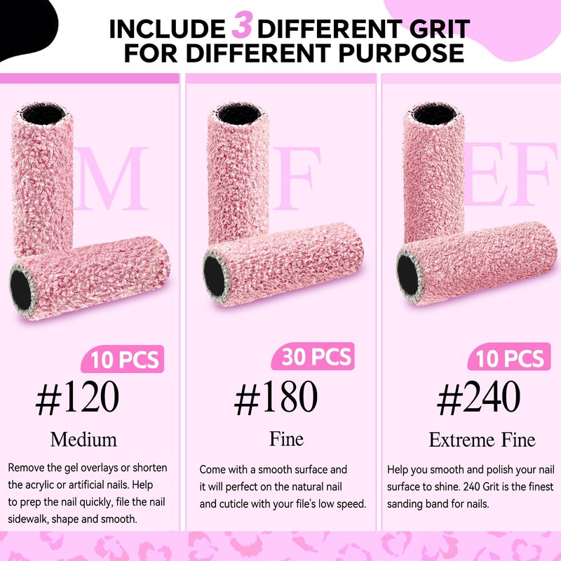 - VARIOUS GRIT OPTIONS - SALVMARY offer different grit for choice. #120 Grit help to prep the nails quickly, file the nail sidewalk, shape and smooth. #180 Grit remove soft nail gel, such as gel nail polish. Fine grit with smooth surface will also perfect on the natural nail and cuticle with your file's low speed. #240 Grit is the finest sanding band for smoothing & polishing your nail surface to shine.