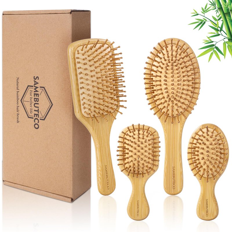 SAMEBUTECO Hair Brush Set Natural Bamboo Bristles Paddle Detangling Brushes for Thick, Thin, Curly, and Dry Hair Wooden Hair Message Brushes(4 packs)