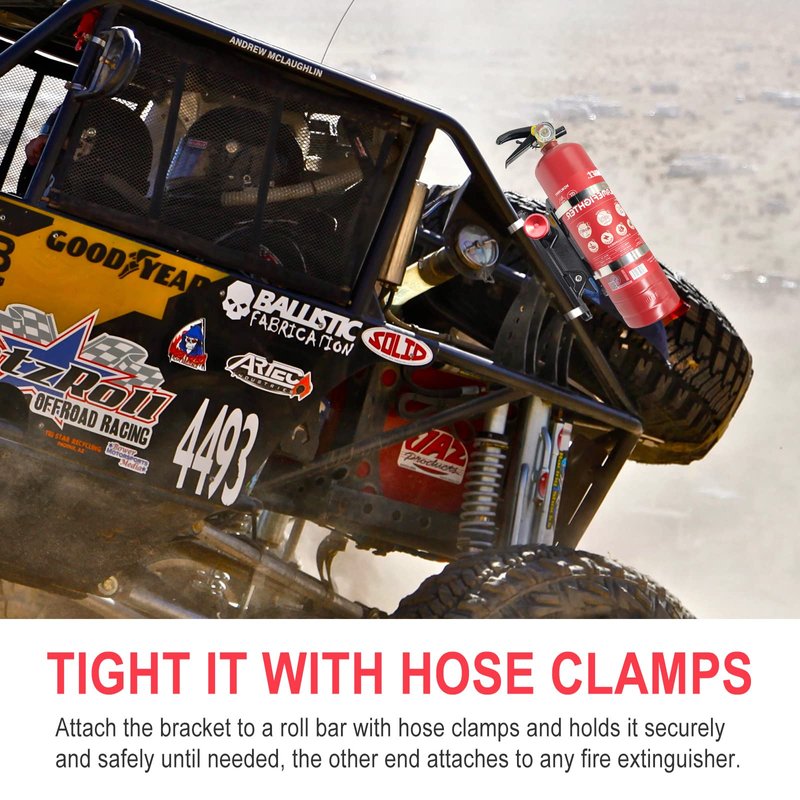 - TWO MOUNTING METHODS: You can tight the off road fire extinguisher mount to the roll bar with the 2 size of hose clamp; Or use the screw to secure the aluminum fire extinguisher mount on the wall/floor or other flat surface, etc. (Screws are NOT included)
