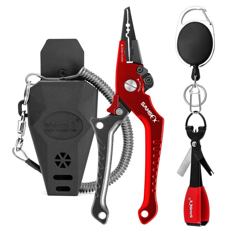 SAMSFX Aluminum Fishing Pliers Hook Remover Braid Line Cutter with Coiled Lanyard and Sheath, Fly Fishing Knot Tying Tool & Retractors (Gray & Red Handle-7'' Split Ring Nose, Fishing Knot Tying Tool)