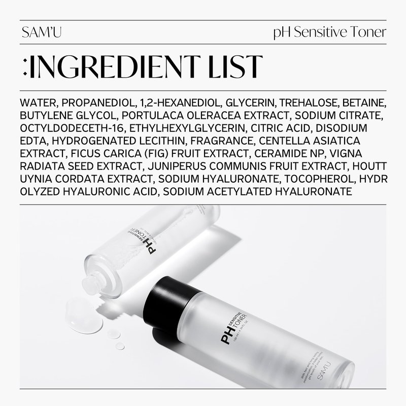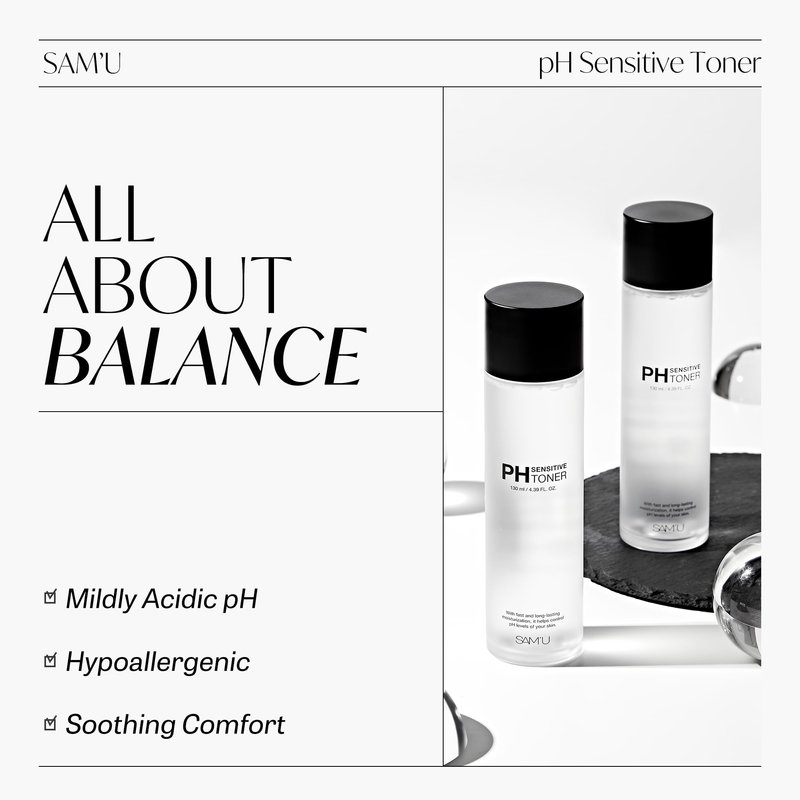 - PH HARMONY FOR RADIANT SKIN. Achieve an excellent balance with SAM’U PH moisturizing toner. Maintaining a skin-friendly pH of 5-6, this gentle toner pampers sensitive skin. Light, non-sticky, and loaded with natural plant ingredients like Juniper Berry and Heart Leaf, for a glowing complexion.
