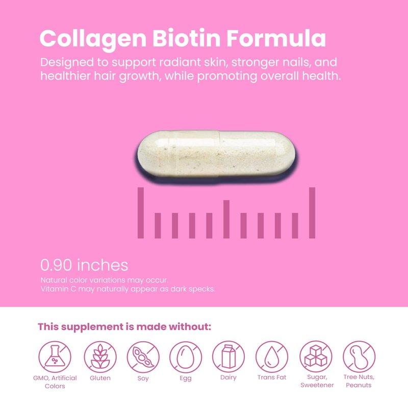 - Biotin and Collagen Vitamins: Our Collagen peptides pills with biotin stimulates the body to renew tissues and maintain radiant skin tone, hair growth and strong nails. Biotin combined in collagen hydrolyzed capsules are are the perfect vitamins for skin.