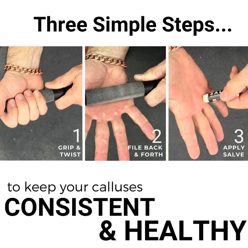- Callus Salve Included - Revitalize your calluses naturally with SandBar nourishing salve. Restores your natural calluses' pliability. No more dry crusty calluses to pick or gnaw on; your hands (your lover) will thank you. Accelerates healing and prevents infection. No greasy residue or skin softeners.