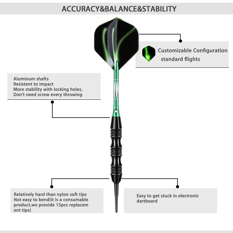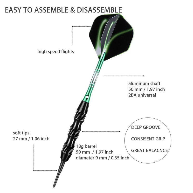 - LOOKS & FEELS GREAT-----This keel design total weight 20 grams soft tip darts set are suitable for all levels player, best choise if you need a heavier darts set. The smooth release and deep groove grip barrel create exceptional performance in darts competition game; Stylish sturdy darts set with green aluminum shafts and high speed flights looks great, it's a ideal gift for friends falimy who in love of darts;