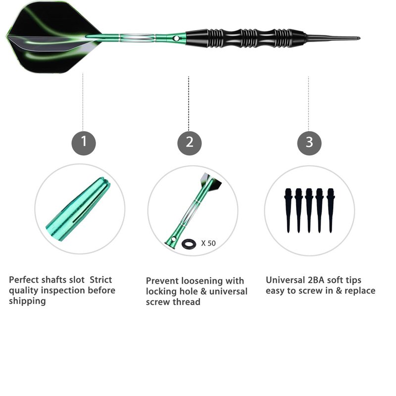 - WHAT'S IN PACKAGE----- Darts set with extra 30 x replacement 2BA universal soft tip points + 3pcs nylon white dart shafts + 3pcs extra flights + 50 rubber O-rings + lifetime warranty, we cover responsibility 100%;