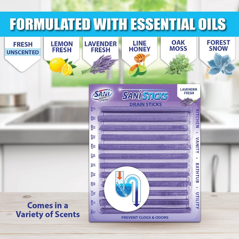 - SAFE TO USE IN ALL DRAINS: Sani Sticks fresh unscented odor-eliminating sink-cleaner sticks only use enzymes to clean, so they’re safe for use in all drains, from the bathroom to the kitchen. Keep your drains safer and smelling fresher with this drain and odor-remover monthly treatment. Sani Sticks are available in many fresh scents, including lemon, lavender, lime honey, orange, pine, apple cinnamon, oak moss, and forest snow.