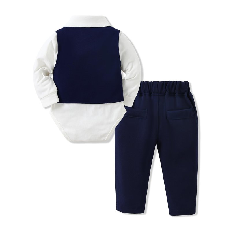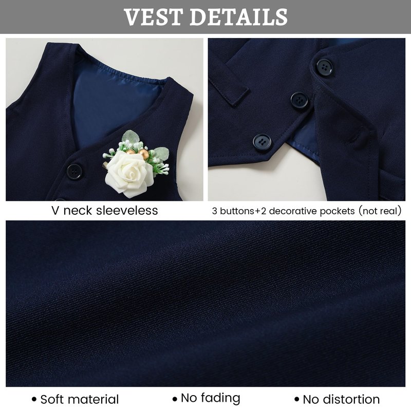- √√Vest Details:This baby boy suit 5Pcs baby boy formal outfits set includes a Detachable Boutonniere and a vest that features 3 buttons single-breasted closure and double lining in the back, optimal warmth, and ease of layering. Built to withstand active play and frequent washing, the baby boy gentleman outfit maintains its shape and quality.
