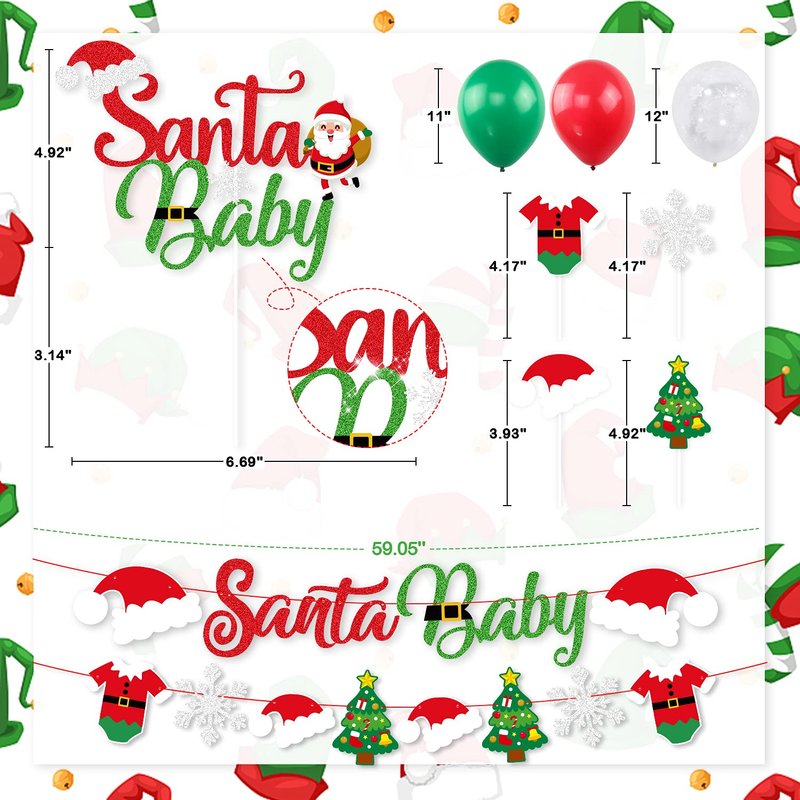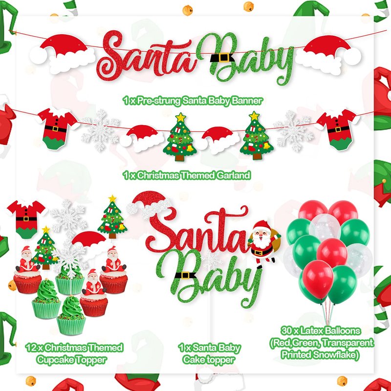 - 🎅 WHAT YOU WILL GET - 1set unique Santa baby banner, 1set Christmas Themed Garland, 1pcs Santa baby Cake topper, 12pcs Christmas Themed Cupcake Topper, 30pcs Latex Balloons (Red, Green, Transparent Printed Snowflake).
