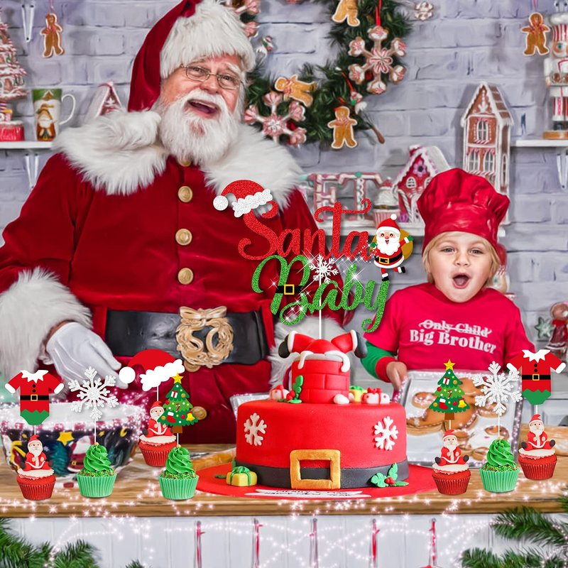 - 🎅 CLASSICAL DESIGN - Pre-strung Santa baby banner designed with red green glitter cardstock with Santa Christmas hat decor, red green and Snowflake balloons will be great to decorate as a cake table photo backdrop. Merry Christmas cake toppers and Santa theme cupcake toppers are perfectly on cakes, cupcakes, cheese cubes.