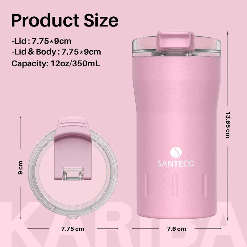 SANTECO Travel Coffee Mug 12 oz, Insulated Coffee Cups with Flip Lid, Stainless Steel Coffee Mugs Spill Proof, Double Wall Vacuum Tumblers, Reusable To Go Mug for Hot/Ice Coffee Tea - Pink