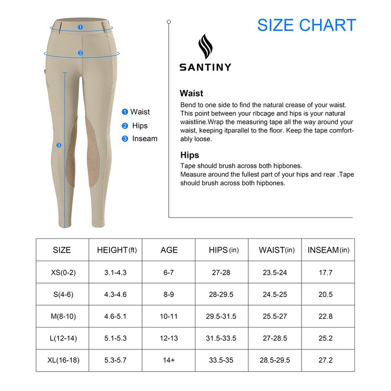 - Waistband with belt loops: Elastic waistband with belt loops that can be worn at both practice and in shows. Santiny girls Horse riding tights are perfect for daily riding lessons, horse show, equestrianism sports, and any type of sport.
