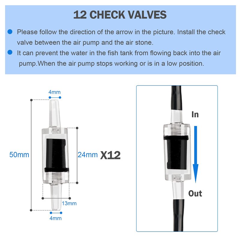 - 4.Fish tank hose Check valves: The aquarium check valves can prevent the water in the fish tank from flowing back into the aquarium air pump.When the fish tank air pump stops working or is in a low position. The aquarium tubing check valve needs to be installed between the fish tank air pump and the aquarium air stones in the correct direction