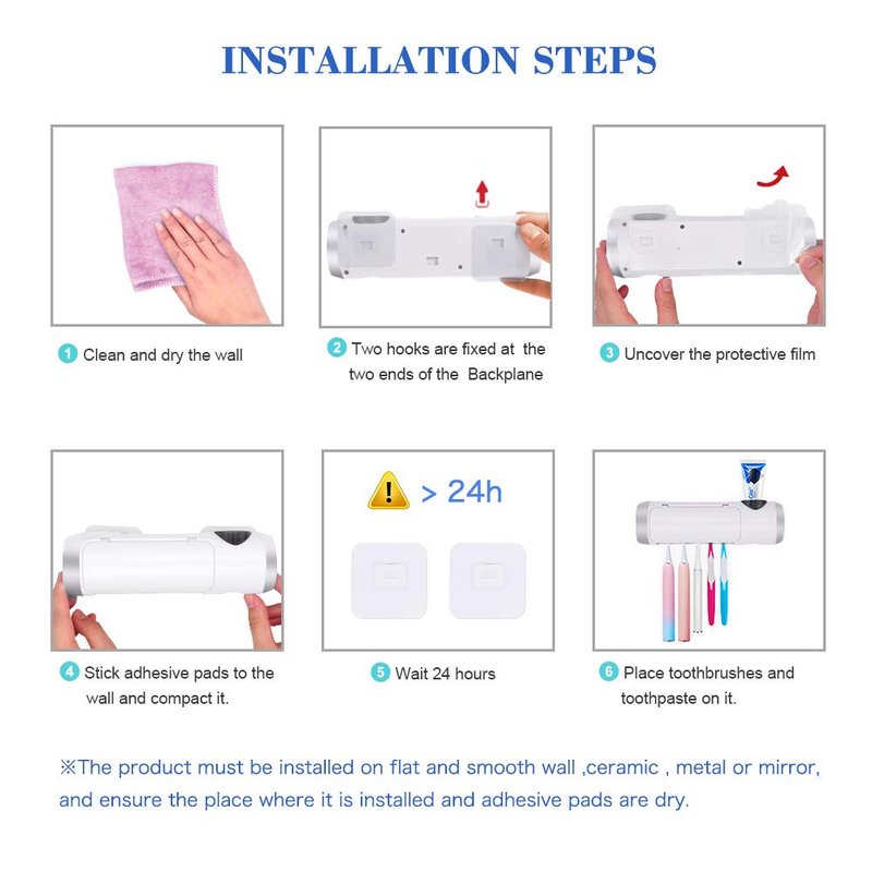 - ▲ NO DRILLING INSTALLATION - Wipe the smooth wall surface with wet cloth and make it dry thoroughly, then stick the two hooks included package on the wall and wait 24 hours before you hang the toothbrush holder on the hooks. Easy to install without damaging the wall.