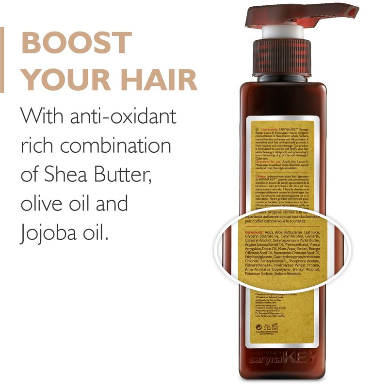 - SARYNA KEY Damage Repair Leave-In Moisturizer has an enriched concentration of Shea Butter which contains natural keratin, softeners and silk proteins.
