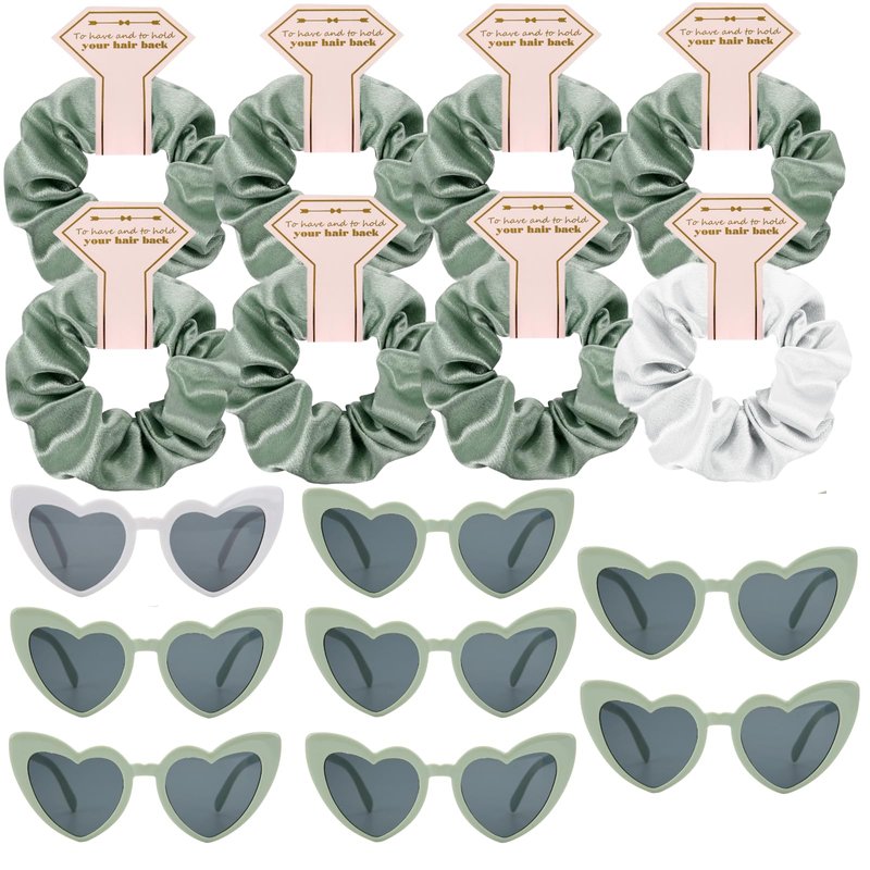 - Good ideas Scrunchies bulk pack includes 8pcs hair Scrunchies and 8pcs sunglasses gifts for the bridesmaid.1pcs for you and 7pcs Beautiful silk shiny sage green Scrunchies for your friend, Perfect as bachelorette party favors and bridesmaid gifts!