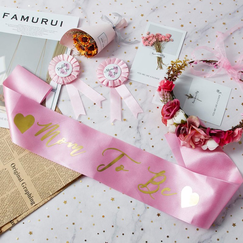 - What you get: a set including a handmade corolla for the pregnant woman, a sash for the mom, a mommy and daddy to be badge pins, a suit of 4 pieces to meet your party needs