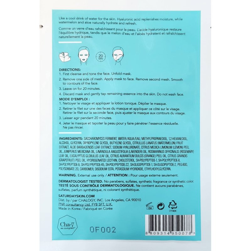 - DERMATOLOGIST TESTED:"Saturday Skin Hydration Mask"NO PARABENS, SULFATES, SYNTHETIC FRAGRANCE OR SYNTHETIC COLOR. Hypoallergenic. Vegan. Clean formula. Cruelty free.