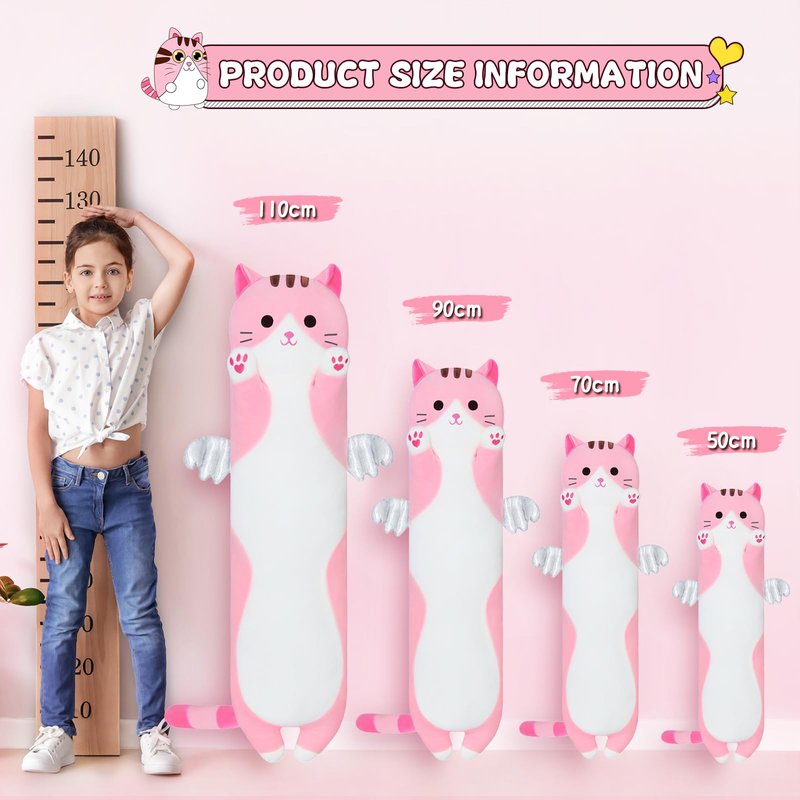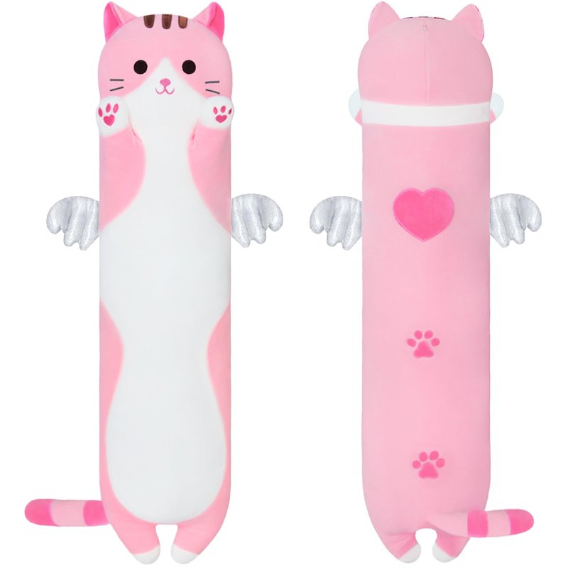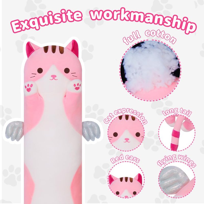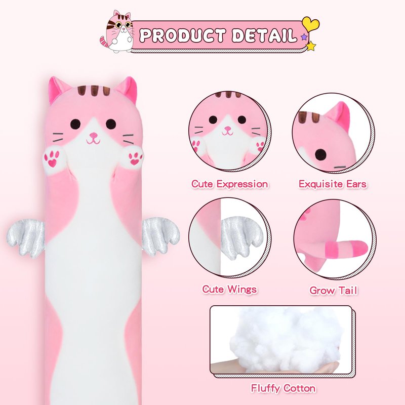 Sausudols Long Cat Plush Body Pillow, Cute Cat Plush Toy Pillows with Wings, Stuffed Animals Kitten Soft Plushies Gifts for Kids Girls Girlfriend(Pink, 19.6in/50cm)