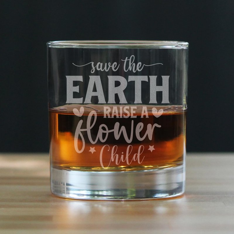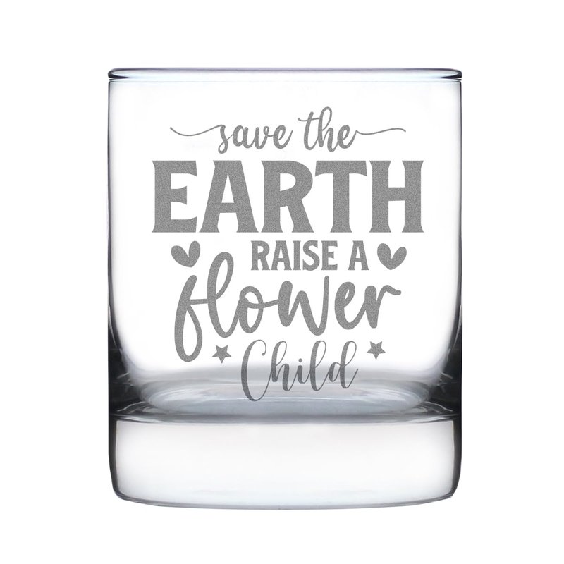 This beautifully hand engraved 10oz rocks glass features a unique "Save The Earth Raise A Flower Child" design, perfect for anyone who loves nature and eco-friendly living. Each glass is carefully etched, making it an ideal gift for nature lovers or a stylish addition to your drinkware collection. Great for everyday use or special occasions, this glass is both functional and decorative.