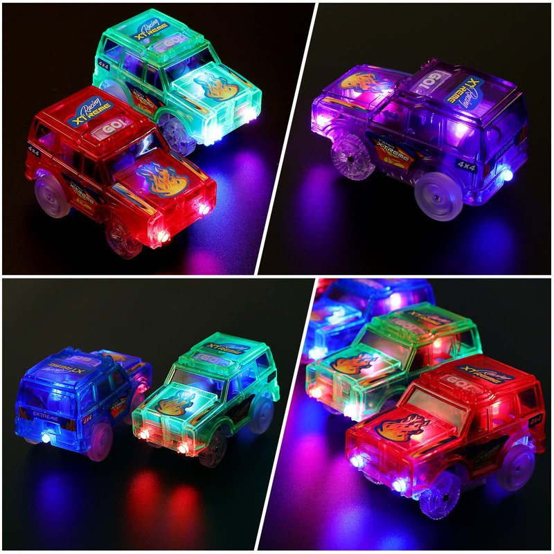 - 🚖【Cool LED Light up Track cars】 - These four cool flexible race track car replacement for magic tracks feature 5 LED lights that kids will be attracted and enjoy it. But for this light up design, plastic has to be thin enough. So these cars had better not hit hard objects or hit walls hard, and do not fall from high places to protect them for long-term usage.