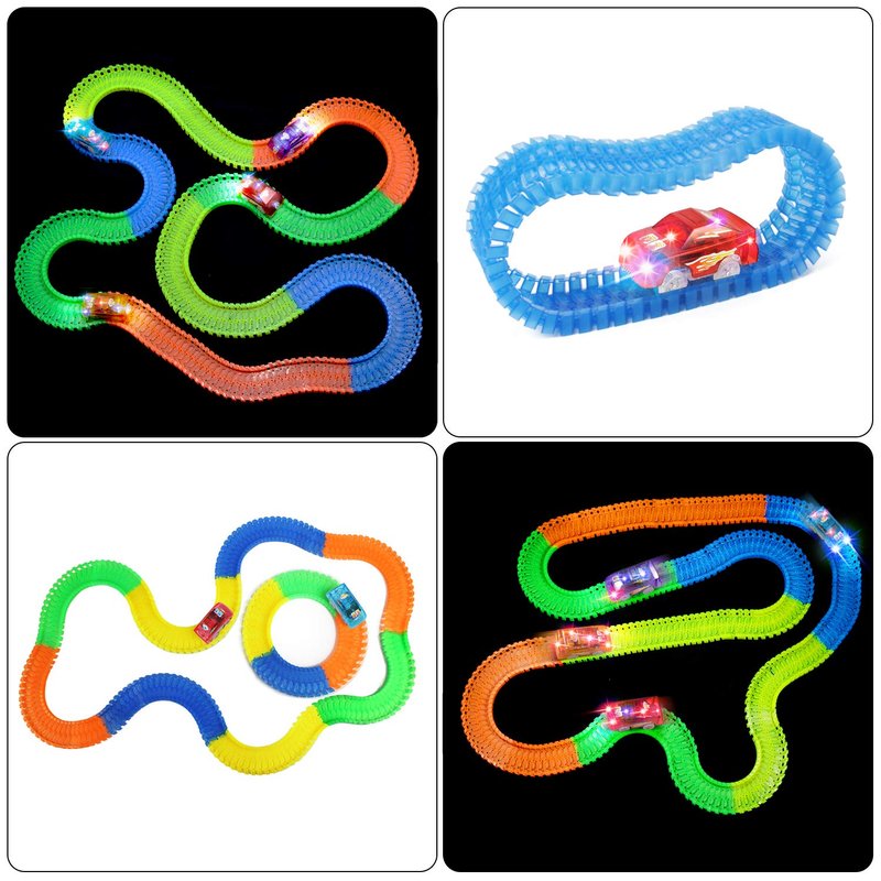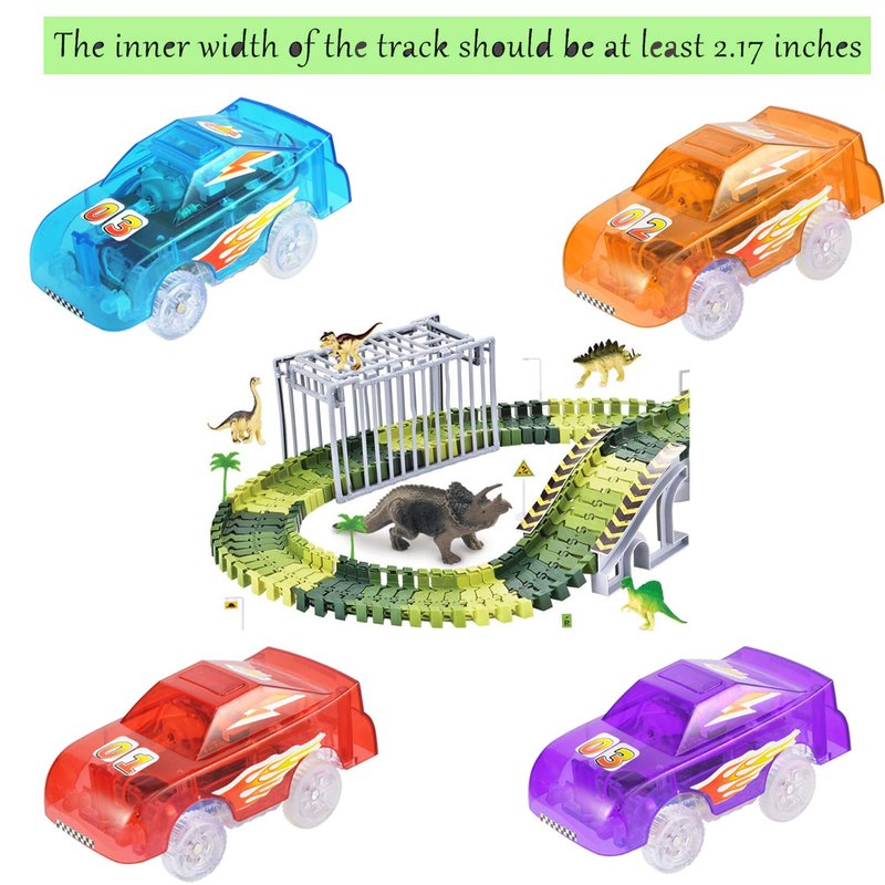 Save Unicorn Track Cars Replacement only, Light Up Track Car Toys Glow in the Dark, tracks accessories compatible with Most Tracks(dinosaur / rainbow toy or Neo Tracks). The best interesting gift for your kids! ★Contact us: As a responsible seller,we are willing to solve any questions for you. If you receive a broken truck or they fails to light up. We will exchange a new replacement for you. If you have any question or suggestion with our track cars, please let us know, we will continuously improve our products. Warm Tips: ★Play under the supervision of adults, please don’t put your long hair near the wheels. ★Do not let your kids come into contact with a screwdriver. ★Package includes 4 toy cars and a screwdriver (NO tracks and battery are included) ★The color may be a little different from the one in photo. If you have any problem, please contact us. ★These race track cars compatible with most race track sets, but the inner width of the track should be at least 2.17 inches. ★Specifications: Type: 5 LED Light up magic racing car toys for tracks Material: Eco-friendly ABS plastic Measure: 5*2.4*8.3 inchesWeight: 75g/carBattery: 2 x AA Battery (not included) ★Package includes: 1* Purple track car 1* blue bus1* Red auto car1* Orrange bus cars1* small screwdriver