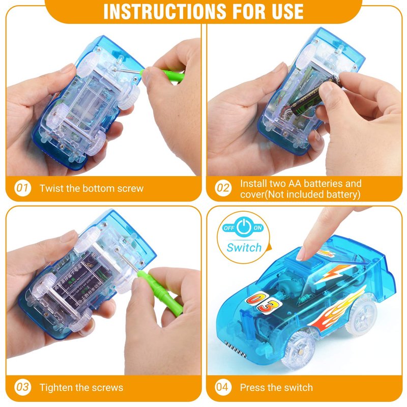 - 【Cool LED Light up Track cars】 - These four cool track cars feature 5 LED lights that kids will be attracted and enjoy it. But for this light up design, plastic has to be thin enough. So these cars had better not hit hard objects or hit walls hard, and do not fall from high places to protect them for long-term usage. If you wanna know more details about this track car, please watch the video at the end of the picture!