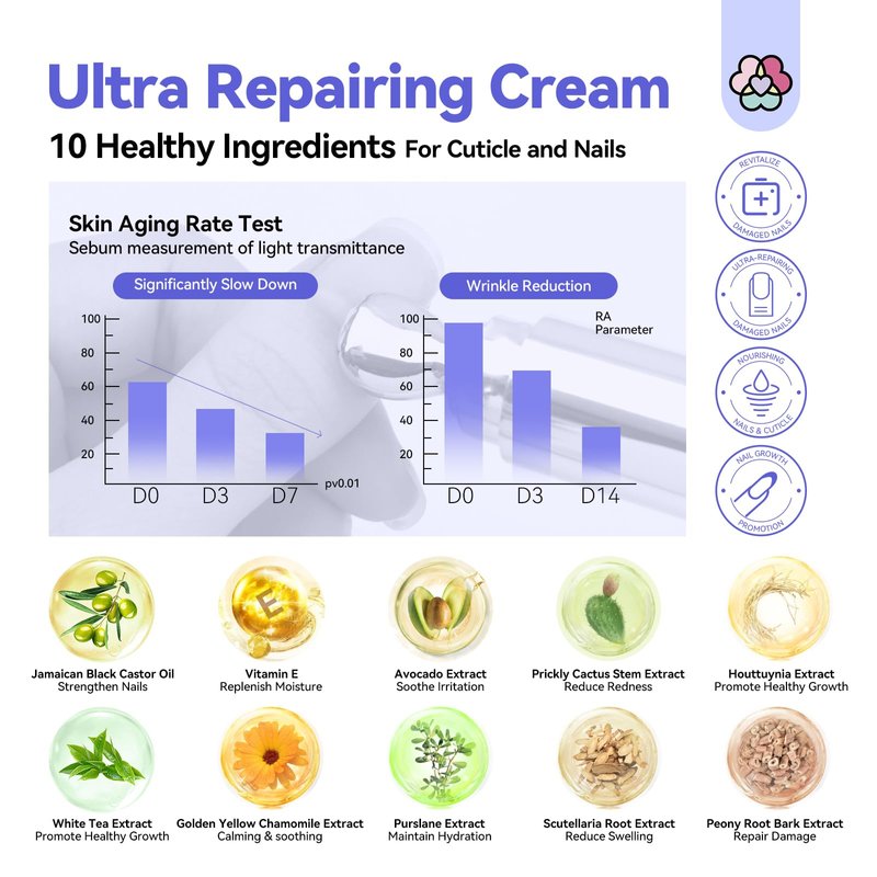 - 🌿【Rich In 10 Natural Ingredients】The repairing cream is rich in 10 natural ingredients, including Jamaican Black Castor Oil, White Tea Extract, Vitamin E, Avocado, Prickly Cactus Stem, Houttuynia, Golden Yellow Chamomile, Purslane, Scutellaria Root, and Peony Root Bark. This cream aims to revitalize damaged nails, provide ultra-repair for brittle nails, and promote nail growth.