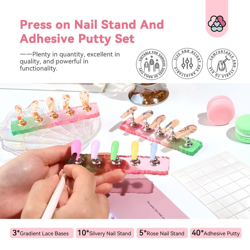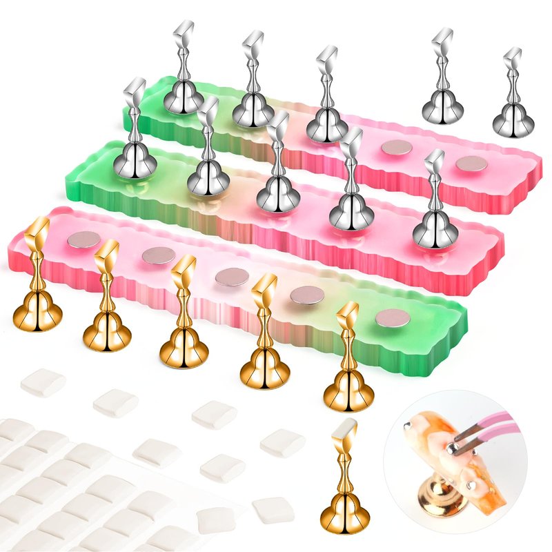 - 💚Saviland Nail Stand for Nail Art Design - This nail holder for painting nails contains 3 sets of nail stand display bases in gardient colors, including 15 pieces of nail practice holders in silver and golden colors, and 40 reusable adhesive putty clay, great for display your nail art, practicing painting your nails, or holders for press on nails, perfect for professional nail artists, beginners and nail art lovers.