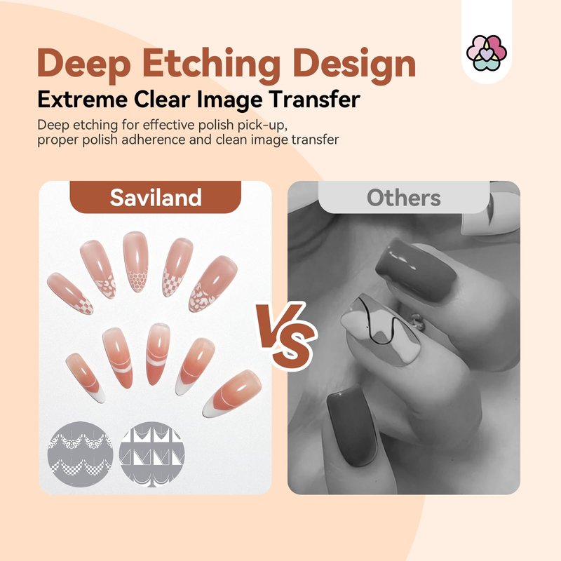 - Superior Polish Pick-Up: SAVILAND Nail Stamping Plate guarantees optimal etching for precise polish adhesion and flawless image transfer. Elevating precision and quality, it facilitates exquisite nail art, whether at home or in salons.