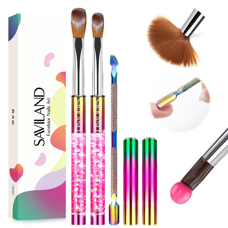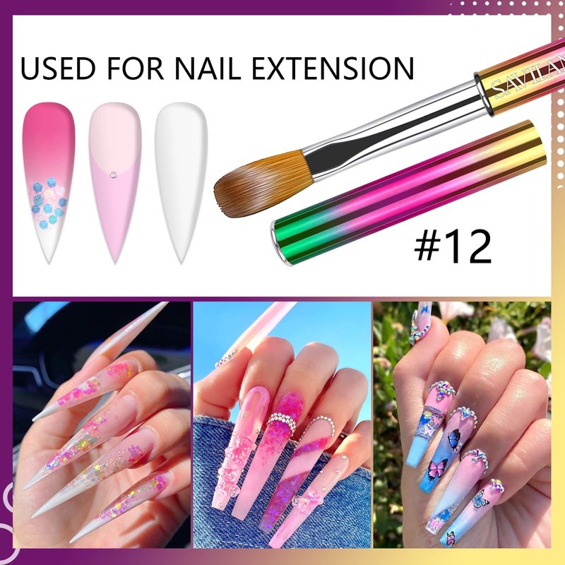 - 💜【ACRYLIC NAIL BRUSH SET】SAVILAND acrylic nail brush set contains size 8 and size 12 acrylic brush and 1pc cuticle pusher. Size 8 can be used for nail carving and size 12 can be used for nail extension. Our acrylic nail brushes and cuticle pusher have a special design, which is laser Gradient color effect.