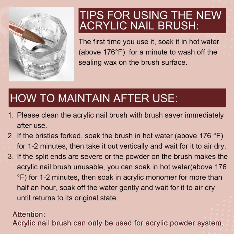 - 💜【WARM TIPS】For optimal performance, we recommend soaking the acrylic nail brush in hot water (above 176 °F) for one minute to wash off the sealing wax on the surface during the initial use. After each use, ensure you clean the nail brush immediately to prevent hardening. The acrylic brush is specially designed for acrylic powder systems.