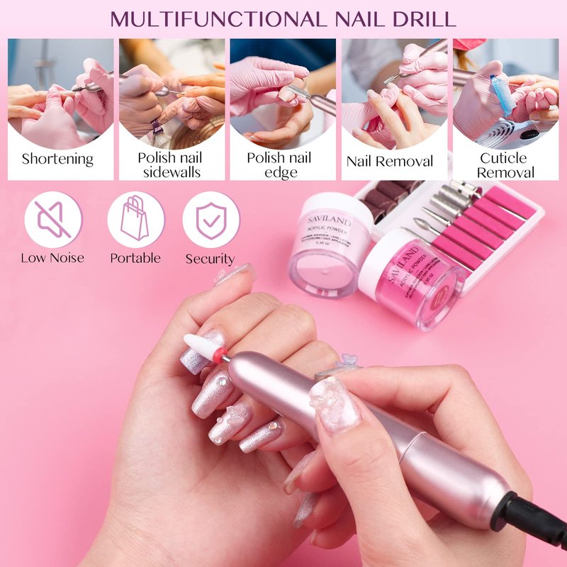 - 【All-in-1 Nails Kit Acrylic Set with Nail Drill】 SAVILAND nail kit acrylic set comes with 3pcs stylish & classic acrylic powder(clear/white/pink), an electric nail drill machine set, 1*50ml acrylic liquid, 1*glass dappen dish, 1*acid-free PH bond, 1*no wipe top coat, acrylic nail brush (#8/10/12) with different functions, 2pcs basic nail tools (nail file & buffer) and 100pcs nail forms to meet your nail art needs. Everything you need to get started acrylic nail art are included.