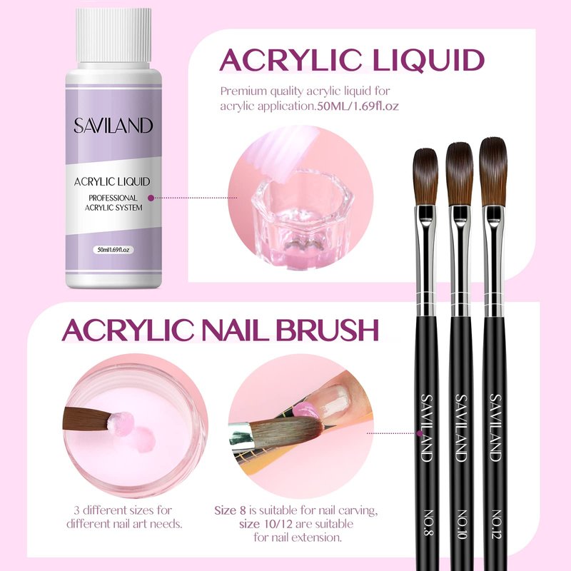 - 【Ideal Gift & Sincere Service】SAVILAND all-in-1 Upgraded Acrylic Nail Set is a must have nail set product & best gift choice for women, nail beginners, nail lovers and yourself on Thanksgiving, Christmas, New Year, birthday, etc. Keep the acrylic powder and acrylic liquid away from direct sunlight and heat. Keep ventilation when using acrylic liquid.