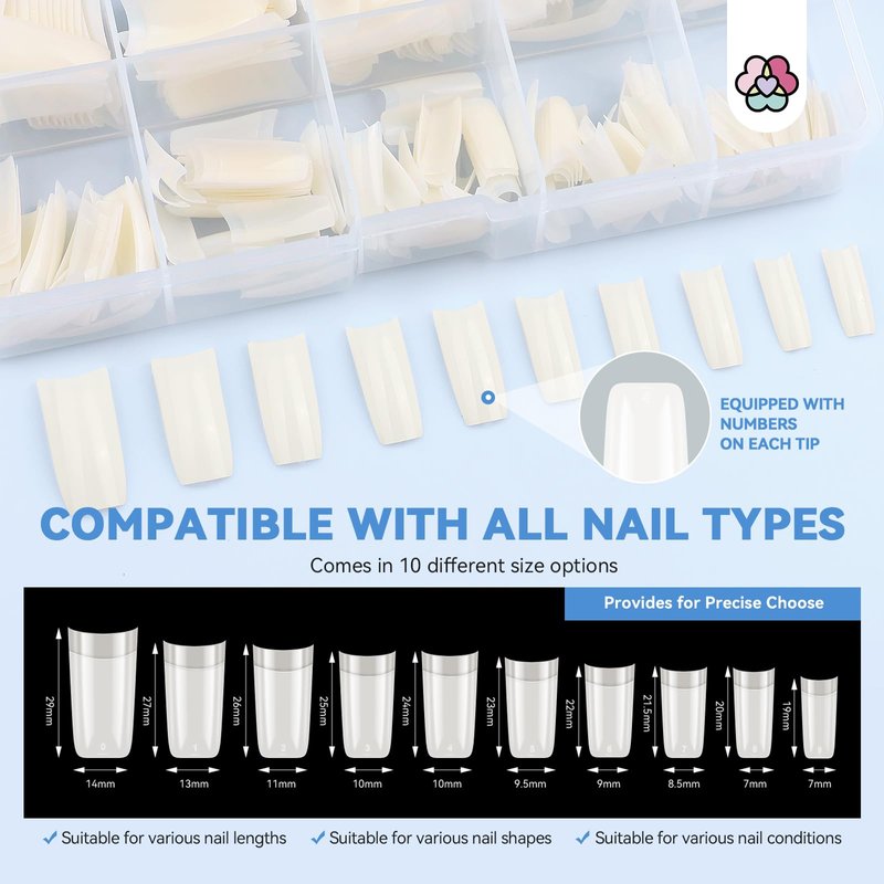 - šć10 Size For Variety and PrecisionćEmbrace versatility with SAVILAND acrylic nail tips that includes 10 different sizes, each comprising 25 pieces. Equipped with tiny numbers on each tip, indicating the perfect fit, your nail art game just got more precise.
