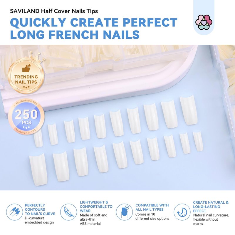 - šćPerfectly Contours to Square Nail ShapećDive into the world of realistic nail extensions with SAVILAND acrylic nail tips. Crafted from soft gel, these half cover tips flawlessly conform to the contours of your nails from cuticle to free edge.