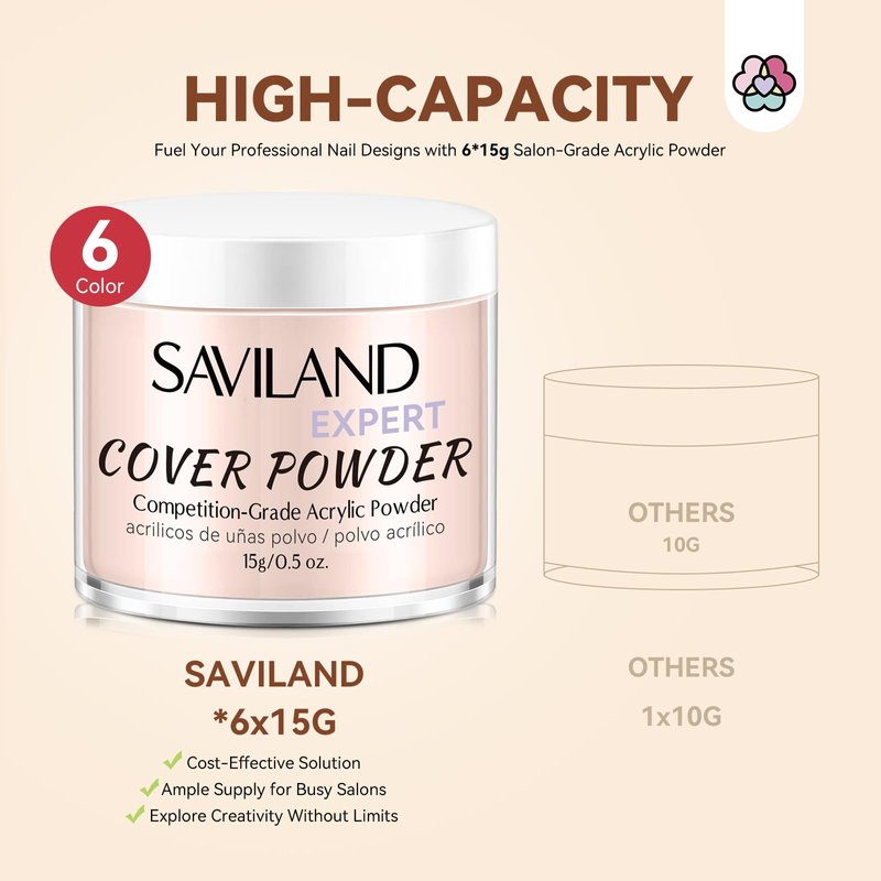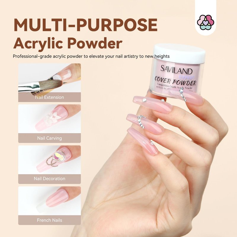- 【Ultra Fine Acrylic Powder】Saviland acrylic powder features smaller particle size for smooth and even application. Its super light texture provides a comfortable and natural feel on the nails. With clump-free finish, it becomes easy to blend, sculpt, and shape.