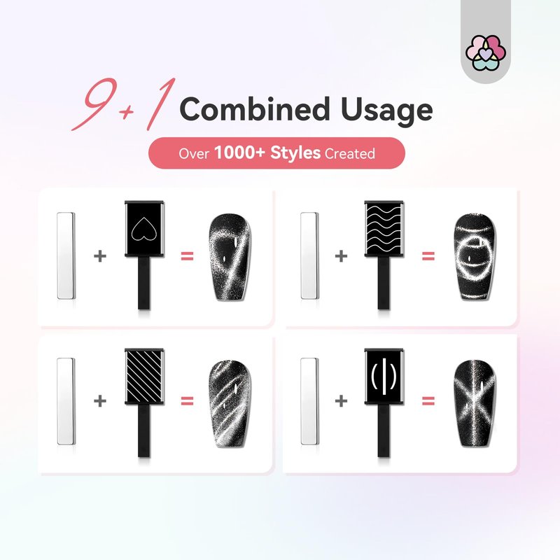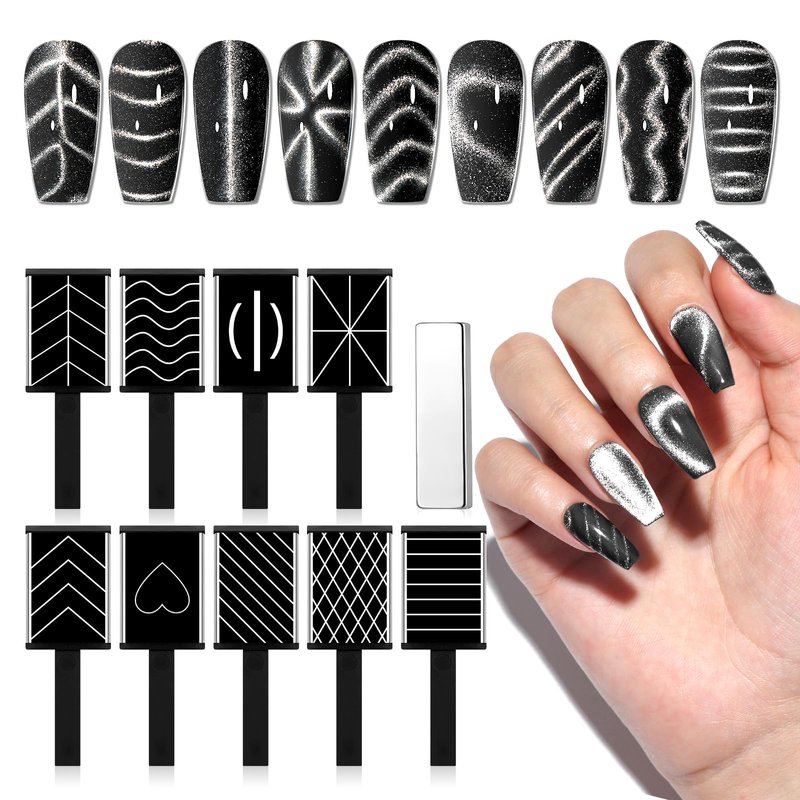 - 🎆【Easy to Use for Beginner】Apply cateye nail polish, hold the square nail magnet close to the wet polish, and watch the magic unfold in seconds. With 10 magnets featuring different patterns, explore a multitude of styles effortlessly.