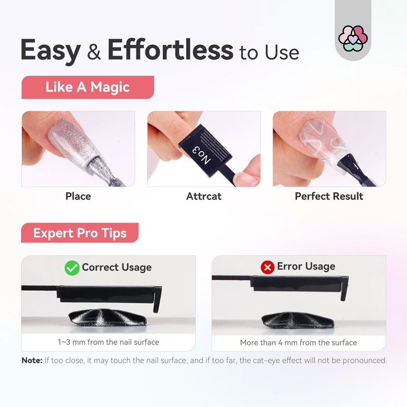 - 🎆【Warm Tips】The magnet plates are easy to hold with a ergonomic groove, but be careful about the distance from nail surface, 1-3mm for the best! Shake the gel evenly before using and immediately cure after using to achieve better effect.