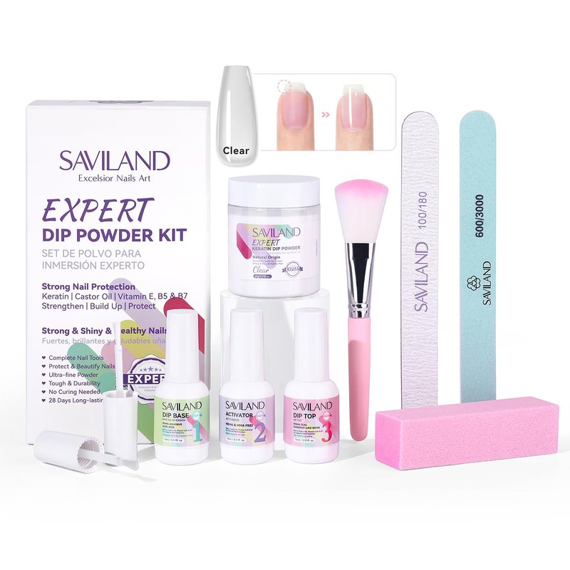 - š¤Saviland Clear Dip Powder Nail Kit Starter: This build powder nail kit contains 1 60g/2.1oz clear dip powder for nails, and dip powder liquid set(dip nail base top coat and activator), and other dip nails French manicure nail art tools. Full dip nails powder starter set for beginners at home DIY or salon professional use.