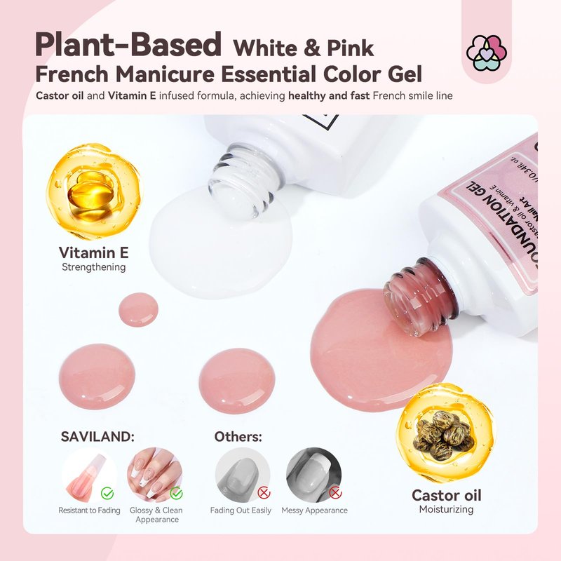 - 🌺 【White & Pink French Manicure Color Gel】This set includes everything for creating classic French nails: white gel nail polish, pink foundation gel, and a glossy top gel. And a plant-based formula enriched with nourishing castor oil and vitamin E, offering moisturization, strengthening, and protective benefits. The French gel nail polish in this set comes with a built-in silky smooth slant brush, ensuring effortless and rapid application for stunning French nails.