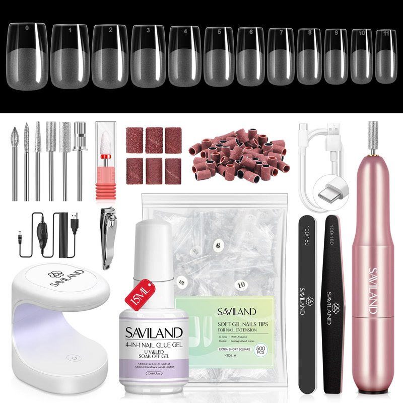 - 【Nail Tips And Glue Gel Kit for Nail Extension】Saviland gel x nail kit contains 1*4 in 1 nail glue gel, 500pcs medium square soft gel nail tips, 1*mini nail lamp, 1*nail file, 1*u-shape nail clipper, 1*sponge nail file, 1*electric nail file.