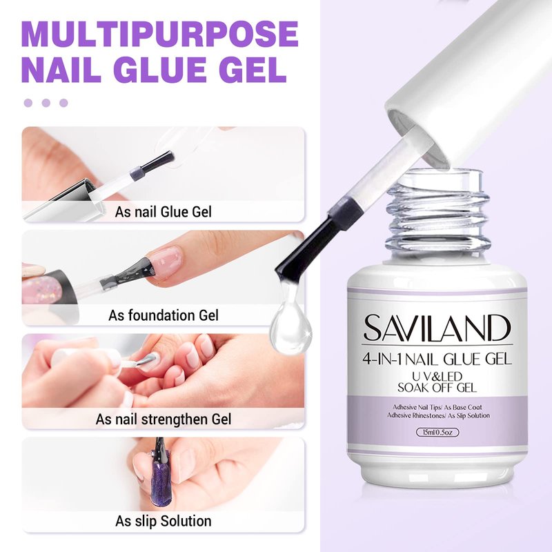 - MULTIFUNCTIONAL: SAVILAND gel nail glue not only can be used to stick nails tips and nail decorations, but also to be as foundation gel to build a good base before doing nail art, as nail strengthen gel to enhance your weak nails, as slip solution for poly nail gel to spread out and shape easily